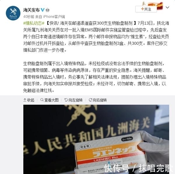 【 邮件|存在严重安全隐患 海关在邮递渠道查获300支生物胎盘制剂】(来源:海关发布)