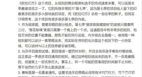 赵金昊发长文解析了“欧拉幻方”这个项目,注意他说的话“从规则的复杂程度和选手的完成速度来看,可以说是本季最难项目之一了”,紧接着赵金昊又分析了这个项目的三个问题:1、95%以上的信息可以忽略,2、试错罚时完全不影响做题进度,3、赛制存在着一定的运气成分。
