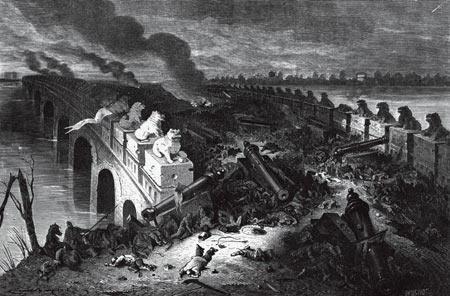 英法联军开始采用大口径火炮射击拼死一战保卫八里桥的埋伏清军,最终占领了八里桥,桥上清军尸横遍野。 蒙托邦回忆:“八里桥成了这一天最动人的一幕。早晨还斗志昂扬的那些清军骑兵,现在都已消失得无踪影了。这座桥是一种古老文明造就的伟大古迹。那些衣着华丽的骑兵,在桥道上挥动旗帜,毫无掩护地以一种对我们的大炮和火炮无能为力的炮火,作出了反击。”