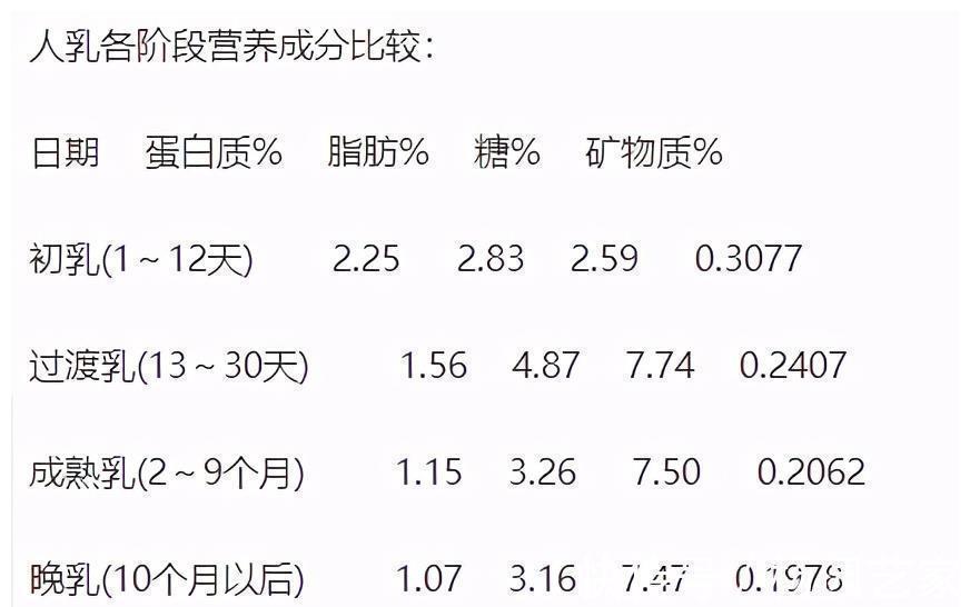 ,这个阶段的母乳,蛋白质的含量最高,脂肪和糖的含量最低,矿物质的含量最高。