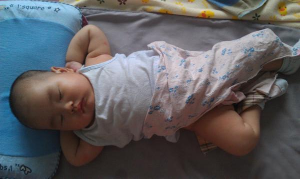 6、弯曲一只腿伸一只腿的宝宝:这种睡姿很随意,说明宝宝性格多偏外向,性格比较随和,人际关系处理得很不错,能很快的适应新环境和集体,做事很理性。