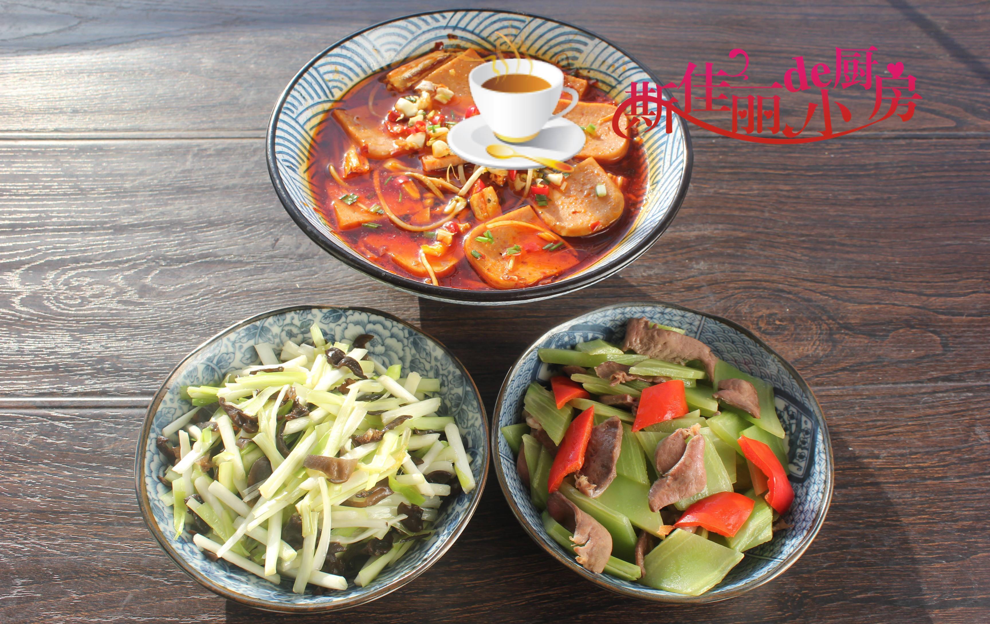 【周一莴苣炒猪心VS水煮腐竹豆芽午餐肉VS木耳炒韭黄】又是新的一周开始,昨天家里吃火锅,还剩下了不少菜,有午餐肉,腐竹,豆芽,就想着将它用麻辣火锅底料炖煮成一锅,麻辣开胃又下饭, 还可以将所有剩菜全部消灭光,真的是一举两得。 不过今天还是准备了些新鲜菜,有猪心,莴苣,韭菜,再泡了上一把木耳,做了两道快手炒菜,木耳炒韭黄和莴苣炒。3道菜上桌,有荤有素,成本不足25元,实惠又美味,比点外卖强。
