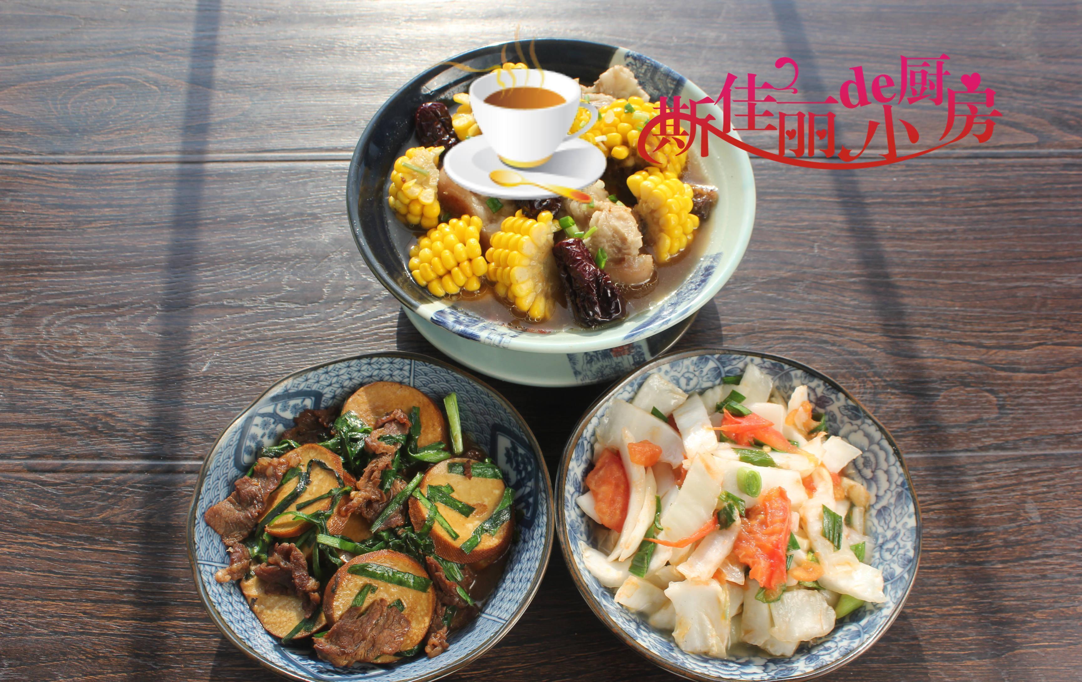 【周三韭菜素鸡炒牛肉VS番茄炒大白菜梗VS红枣玉米猪弯汤】最近一段时间感觉皮肤特别发干, 就想着给肌肤补补水了,今天特地买了一个猪蹄回来,用它搭配着玉米和红枣,炖煮锅滋补养颜汤“红枣玉米猪碗汤”,女人就是要对自己好一点,照顾家人时也不要忘记关爱自己。孩子爱吃牛肉,我常会买上些牛里脊来炒菜,一道“韭菜素鸡炒牛肉”,简单营养又美味,只需五分钟上桌,孩子百吃不厌。 用剩下的大白菜梗与番茄来上一道“番茄炒大白菜梗”,清脆爽口,酸甜开胃,意想不到的好吃。午餐的2菜1汤,鲜香味美,好吃又下饭,母子俩人吃得开心又满足。