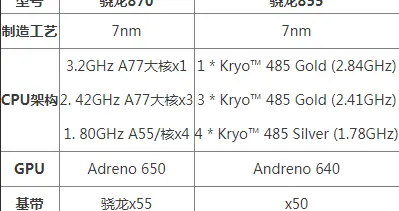 小结:两款处理器在相同的制作工艺中,是有着相差无几的能耗。 2、CPU 骁龙870:3.2GHzA77大核x1+2. 42GHzA77大核x3+1. 80GHz A55/核x4 骁龙855:1+3+4,大核架构也是基于ARM最新的A76架构,小核架构...
