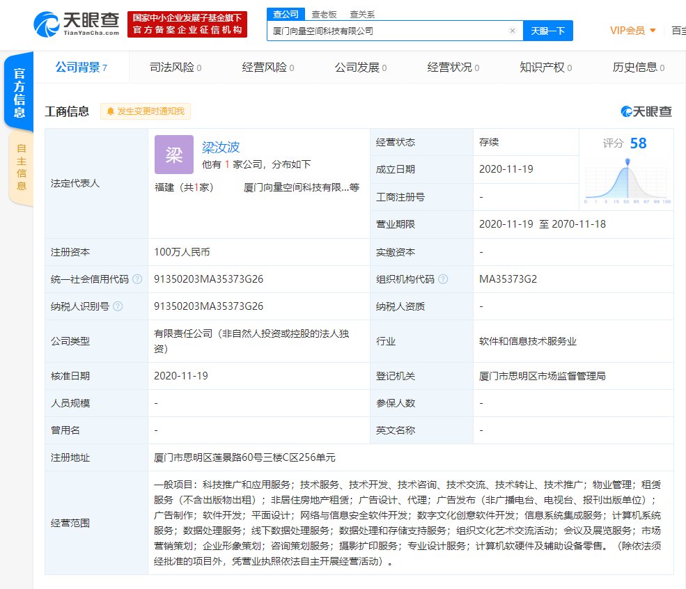 【环球网综合报道】11月19日,厦门向量空间科技有限公司成立,法定代表人为抖音短视频创始人梁汝波,注册资本100万人民币,经营范围含科技推广和应用服务、数据处理和存储支持服...